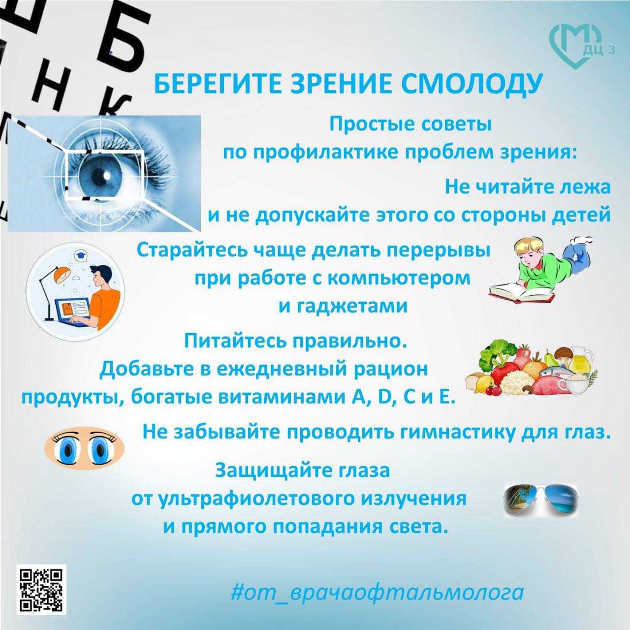 Беречь зрение смолоду — значит соблюдать правила гигиены зрения, выполнять упражнения для глаз, правильно питаться и, при необходимости, использовать медикаментозные средства, назначенные врачом.